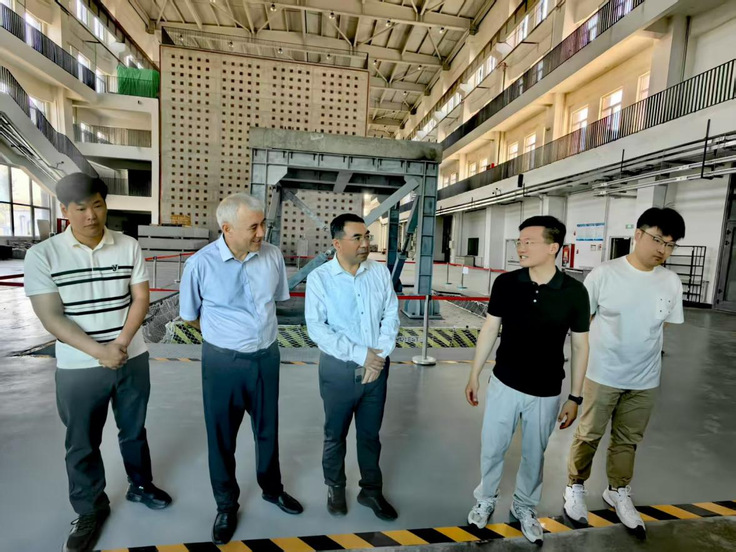 蔡国军一行首先参观了新疆大学“地震模拟振动台试验系统”实验室,听取了该振动台试验系统功能特点及应用情况的介绍,并交流了我校目前在建高频双台阵地震模拟平台的建设进展与特点。
