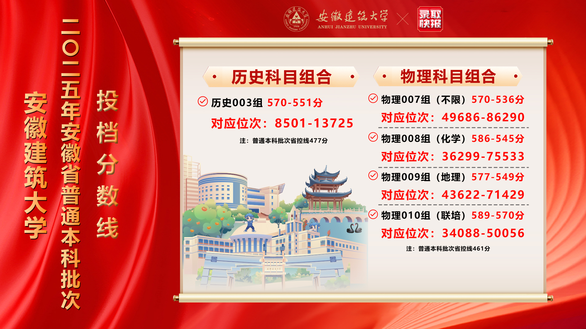 改革才有出路,创新才有未来。本年度,在全国土建类高校分数线总体低迷形势下,我校本科招生再次逆势上扬,省内招生方面,在皖历史类、物理类各专业组投档分数线全面上涨,录取名次取得新突破,普通本科批历史类、物理类各专业组均一次录满,再度成为全省唯二无征集志愿大学;省外招生方面,学校在全国18个省份投档线均有较大增长,其中广西、内蒙等多个省份涨幅超万名,浙江省涨幅近5万名。学校学科专业改革力度和计划投放方案精准度再次通过大考检验,充分反映省内外广大考生及家长对学校总体认可度。