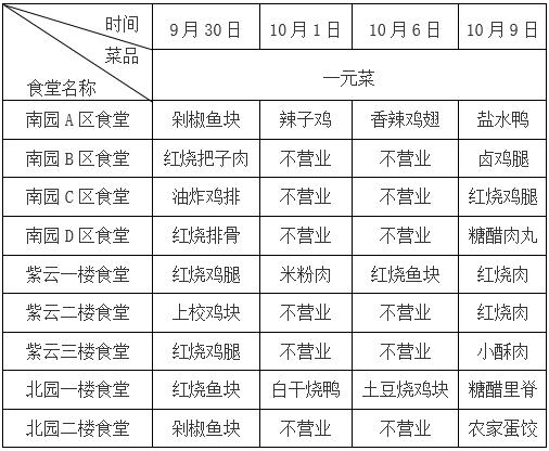 一、营业调整:紫云路校区南园A区食堂、紫云一楼食堂,金寨路校区北园一楼食堂放假期间正常营业,其余食堂停止营业,10月8日中餐起所有食堂恢复营业;两个校区教工餐厅放假期间停止营业,10月9日起恢复营业。