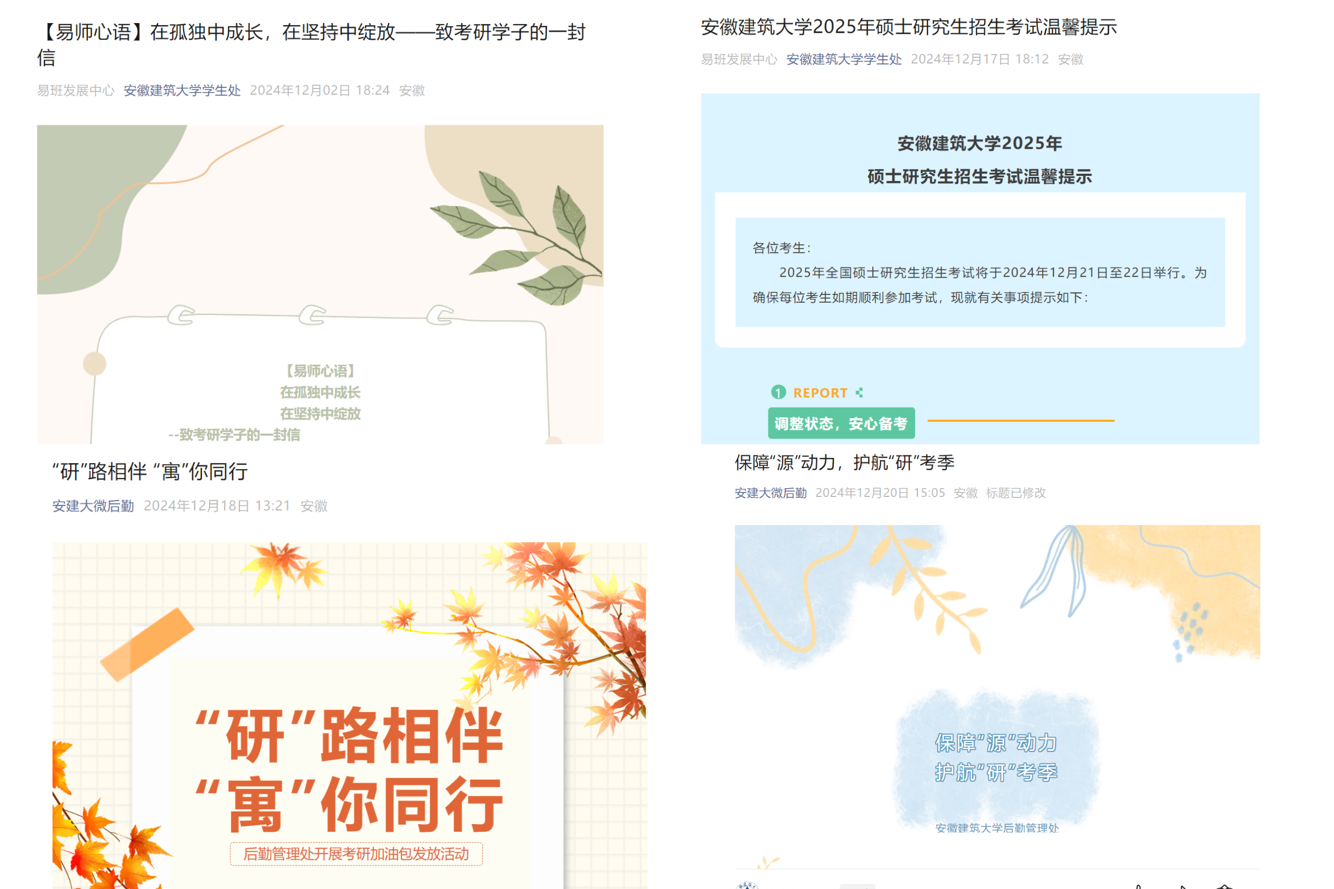 学校各部门、各学院积极践行“研考精神”,紧密锚定考生需求,开展多元化暖心服务。后勤处精心组织开展“寒冬送暖,‘食’力助考”等系列暖心服务举措,向全体考生提供免费早餐和冬至节令餐饮,发放免费午餐券,赠送文具、保暖手套、围巾、水果等备考“加油包”,在各考区提供姜茶、能量食品,为考生加油鼓劲;呼应考生反馈,设置午间休息室,增加考场空调开放时间,设立研考专用绿色窗口方便各校区入校考生就餐、休息。学生处、各学院举行考前动员会、学生座谈会、宿舍走访等形式多样的活动,为考生减压赋能。各学院开展各具特色的考前送祝福、发放大礼包等暖心活动,金寨路校区各学院开通送考专车,建规学院教师连夜加班为入校考生设计专用地图。全校教职工用心用情优化服务,为考生提供温馨舒适的考试环境。